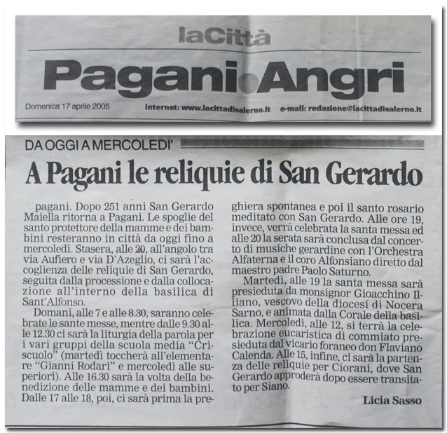 Pagani. Dopo 251 anni San Gerardo Maiella ritorna a Pa gani. Questa sera le sacre reli quie del Santo Protettore del le mamme e dei bambini, in occasione dell'Anno Gerardino, arrivano in processione nella cittadina dell'Agro per restare fino a mercoledì nella Basilica Pontifìcia di Sant'Al fonso Maria dei Liguori.