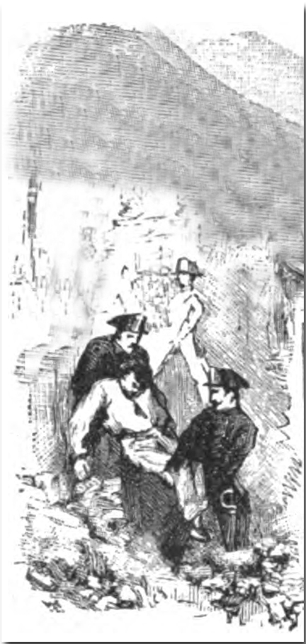 Questi militari, animati dal piu ardente sentimento di filantropia, sfidando ogni pericolo, saltano giù nella cava e si danno tosto con ansia febbrile a rimuovere la grave mora di terra che incombeva sui miseri sepolti.