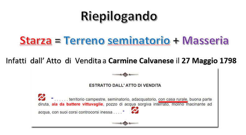 Maggiore dettaglio sulla tipologia di terreno identificato come Starza, la troviamo nello specifico atto di vendita (*) della stessa, da parte del Re di Napoli Ferdinando IV di Borbone al Sig. Carmine Calvanese , vendita avvenuta il 27 Maggio 1798.